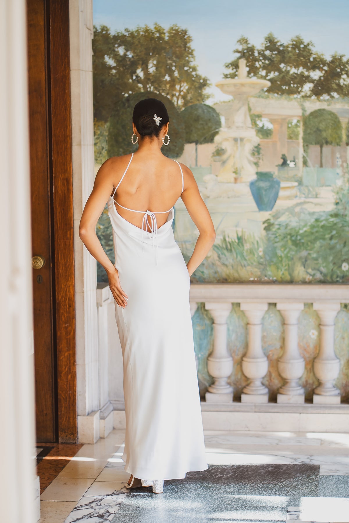 Maxi satin dress Halter neckline Open back with crossover straps Adjustable ties at the back Fits true to size Model measurements Model is 5"7" and wearing a size S