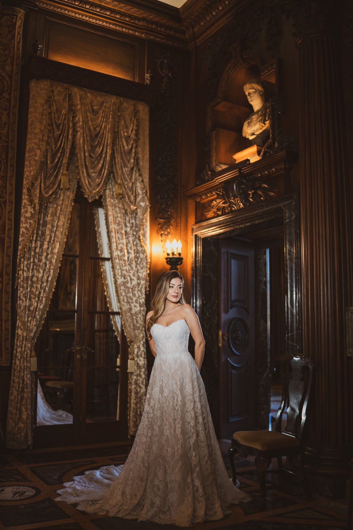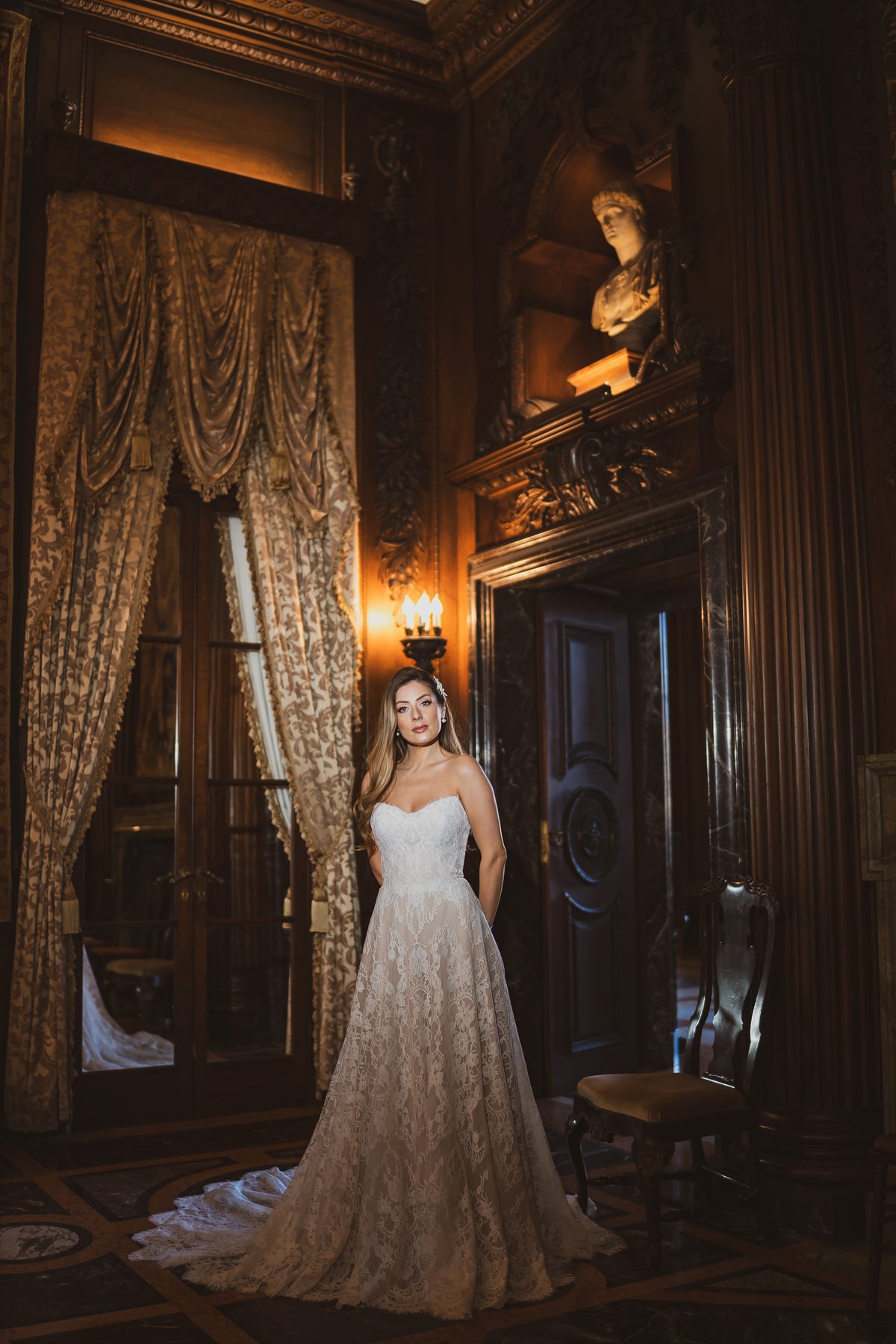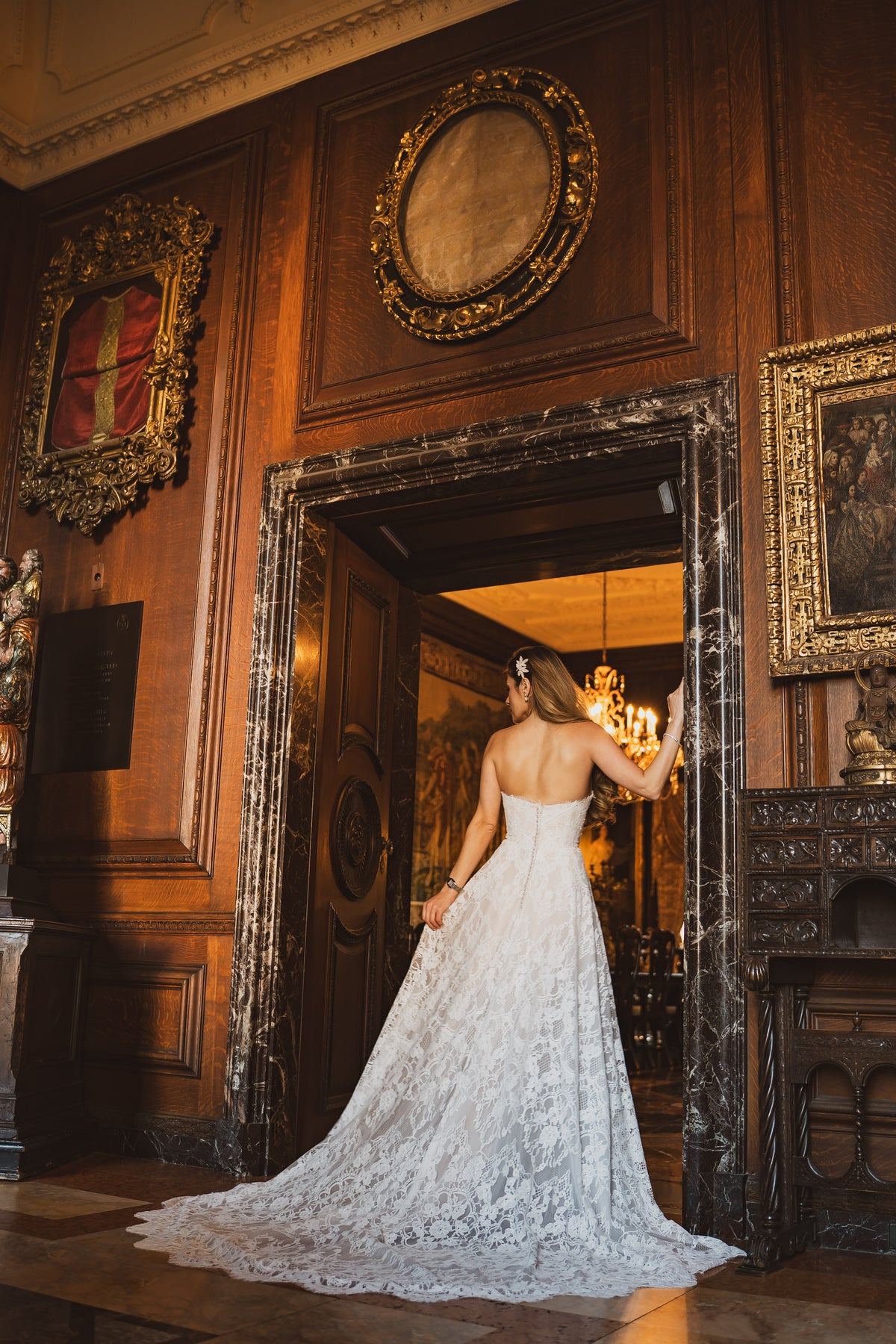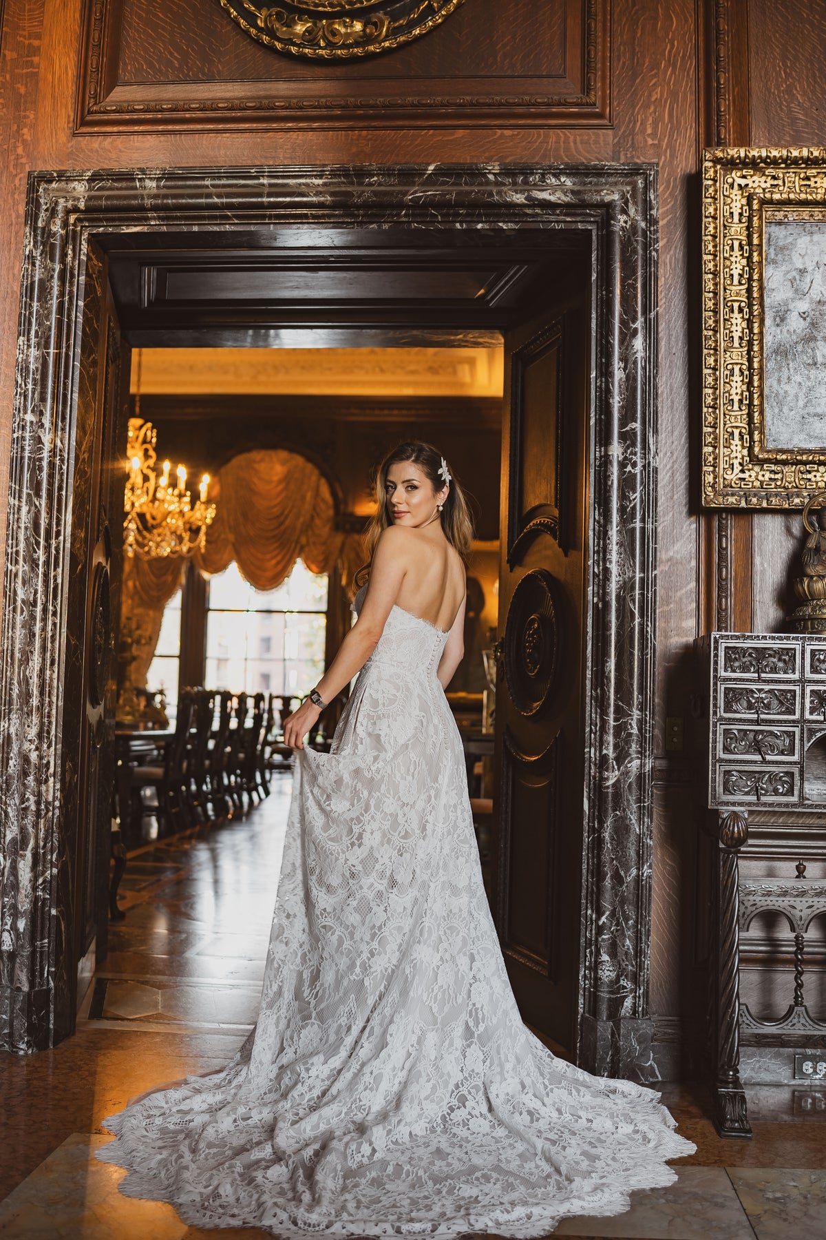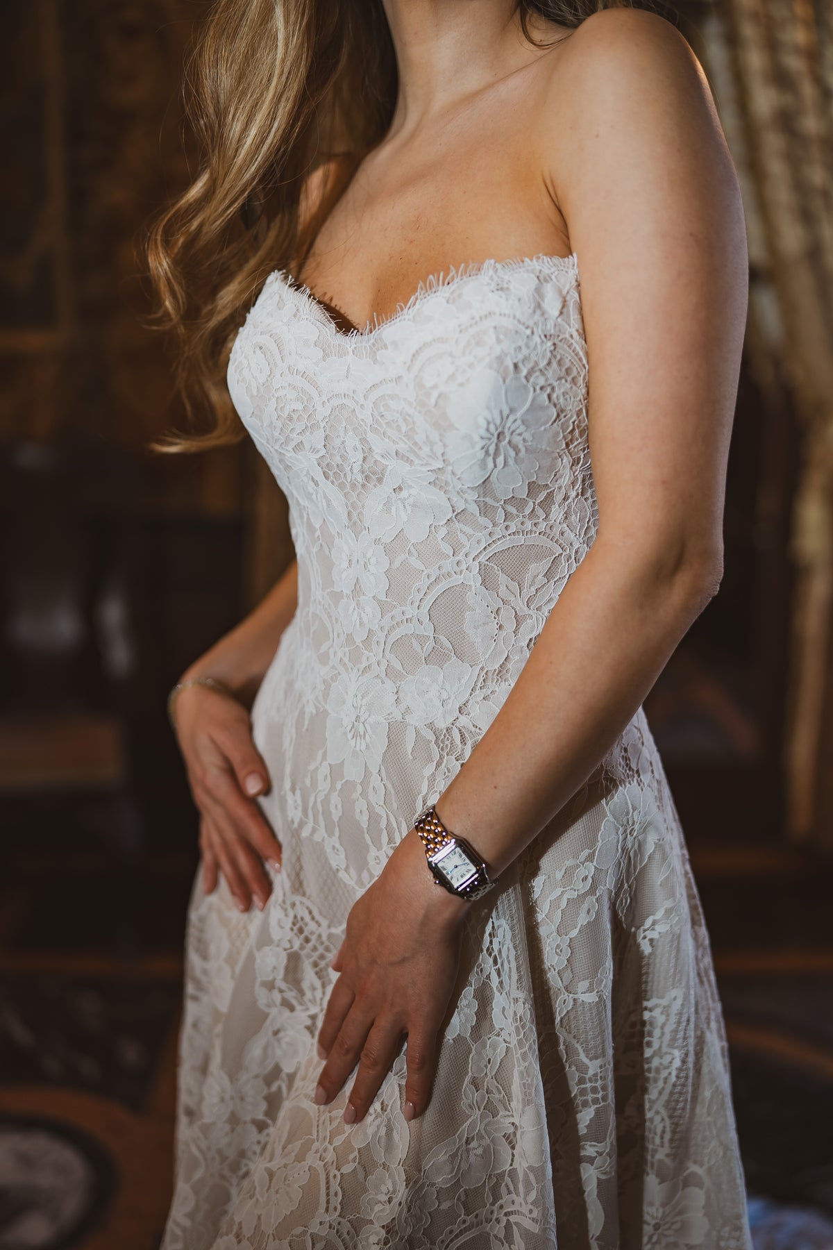 Eden showcases delicate lace in a graceful A-line silhouette. The soft sweetheart neckline and sleeveless design create an ethereal aesthetic, while the floor-length hem provides understated elegance for the modern bride.