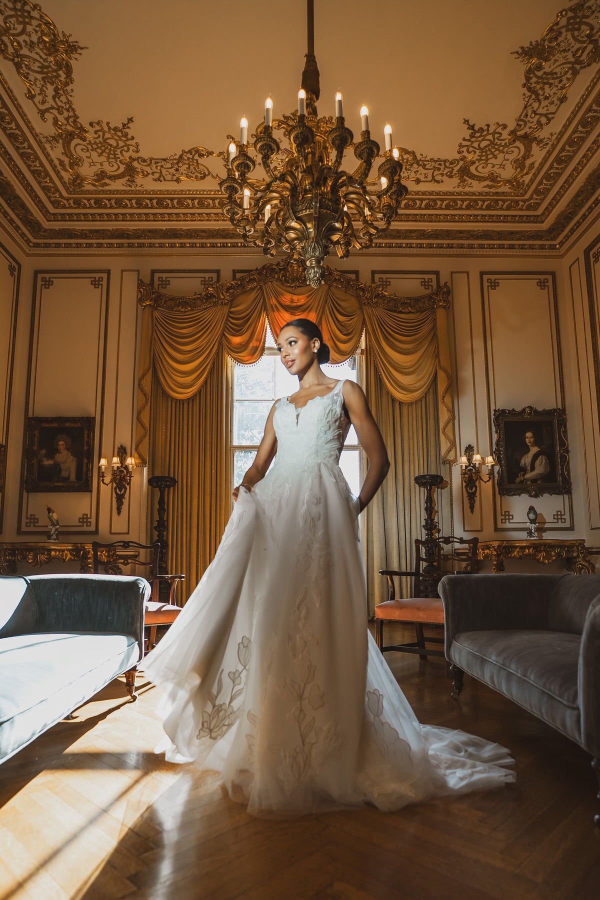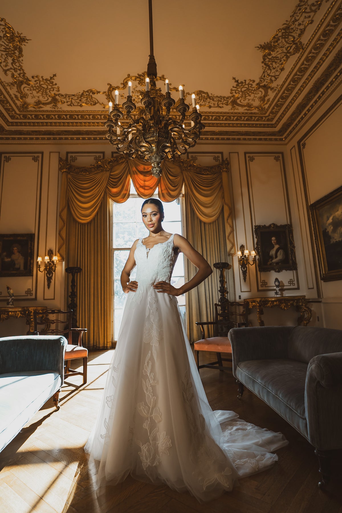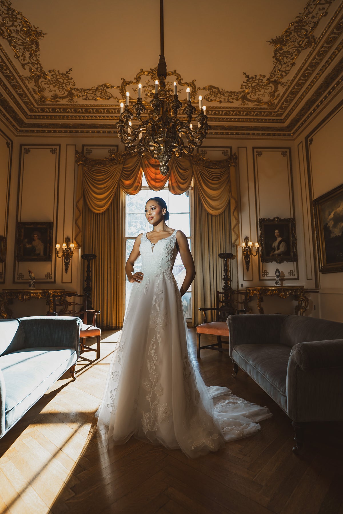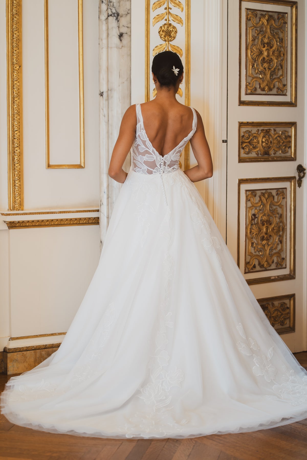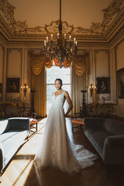 Lyra combines dimensional floral appliqués with a flattering A-line silhouette. The V-neckline and sleeveless cut offer refined simplicity, while the floor-length design ensures timeless bridal appeal.