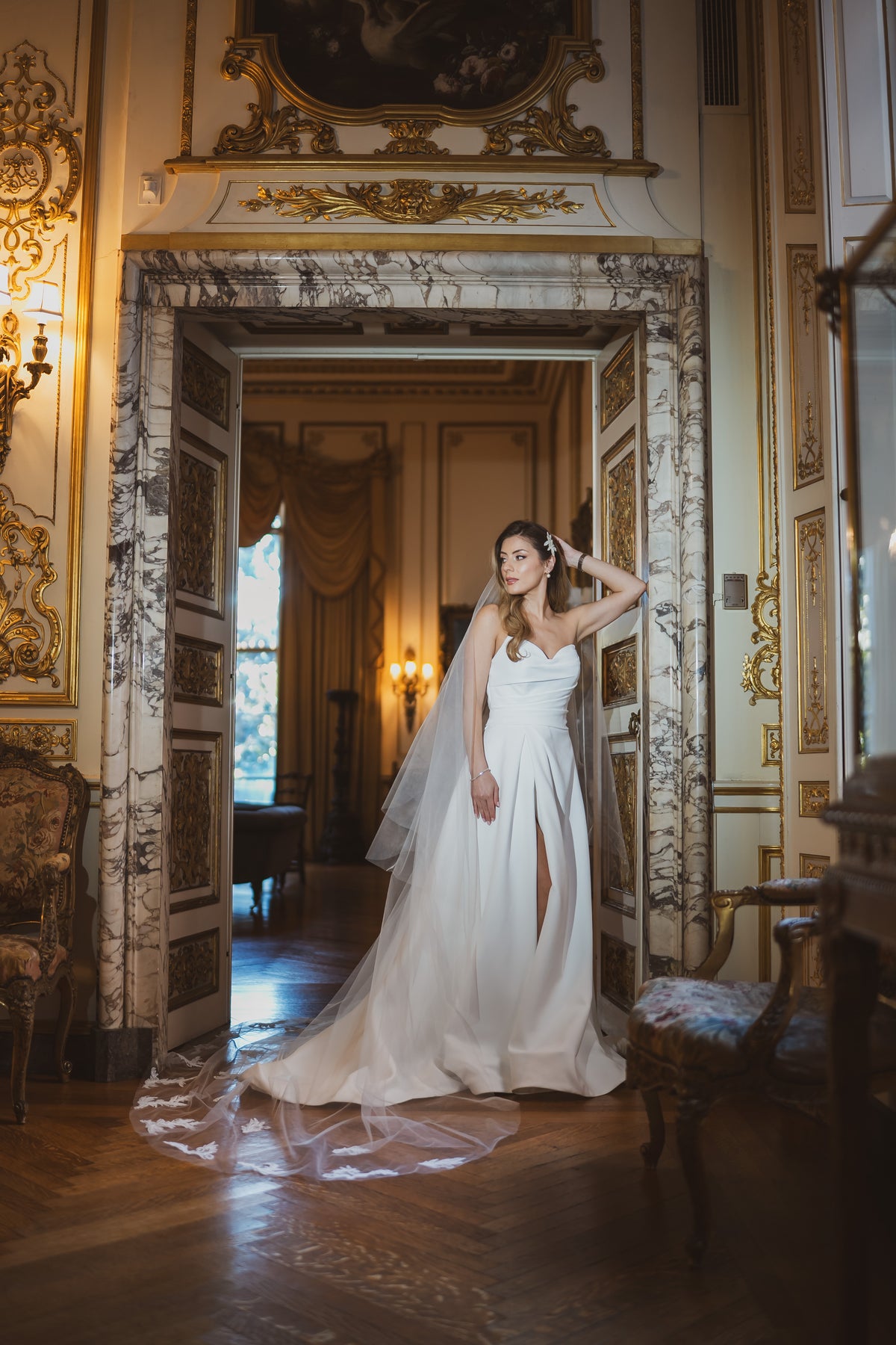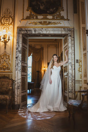 Rosalie pairs lustrous satin with a romantic ball gown silhouette. The sweetheart neckline and sleeveless cut frame the shoulders beautifully, while the floor-length skirt exudes timeless bridal grace.